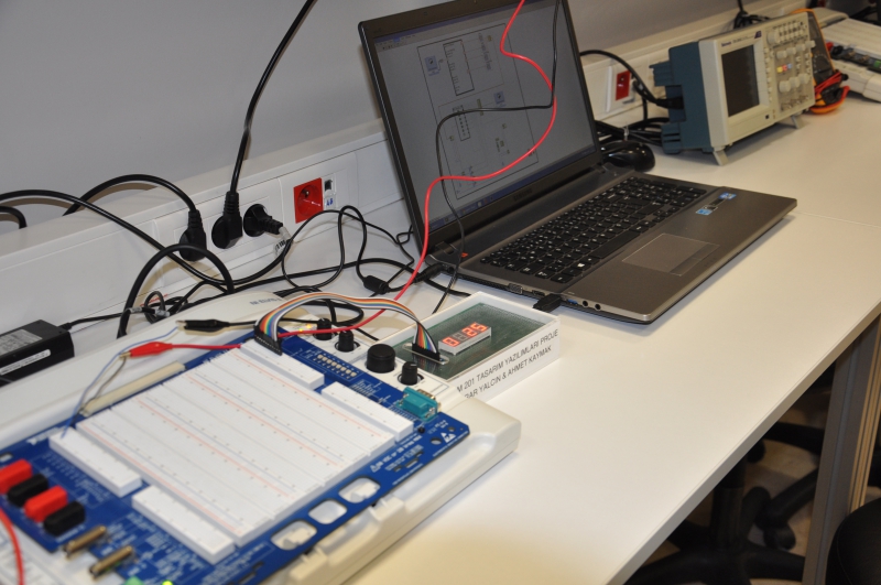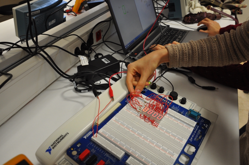 BLM201 Tasarım Yazılımları dersinde öğrencilerimiz LABVIEW ve NI ELVIS II platformu kullanarak 4-rakamlı bir PC voltmetre tasarladılar. Bir gerilim kaynağından aldıkları voltajı rakamlarına ayırıp, multiplex tekniği kullanarak ELVIS II üzerinde gösterdiler. Projeler B blokta poster ve fiziki sistem olarak sergilendi.