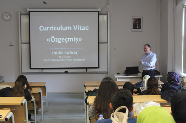 Etkili CV hazırlama konusunda sunumunda örmekler vererek, CV’de içerik ve akış olarak nasıl ilerlemek gerektiği konusunda detaylar verdi. Ön yazının öneminden bahseden Rutkay,” Ön yazınızı içten ve nazik bir dille yazın. Ön yazı, CV ve mülakatta kendinizi geliştirirseniz işsiz kalma olasılığınız azalır.” dedi.