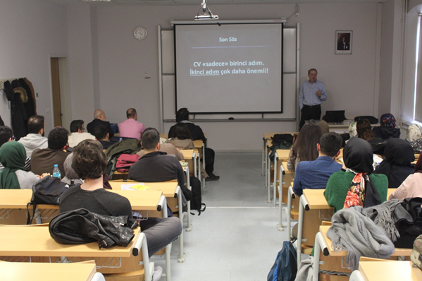 Mülakat süreçlerinden örnekler vererek bahseden Rutkay, “sizi mülakata çağırdıklarında kendinizden emin, azimli, net olmaya çalışın ve karşınızdaki kişinin gözüne bakarak konuşun.” diyerek öğrencilerimize tavsiyelerde bulundu.
